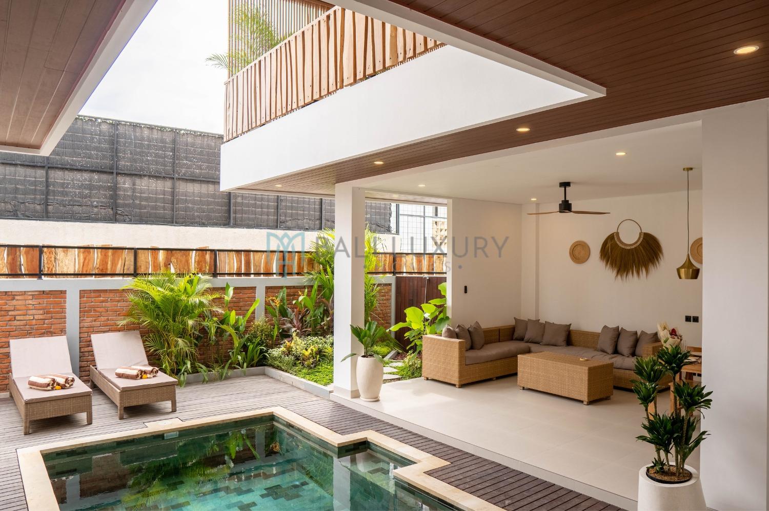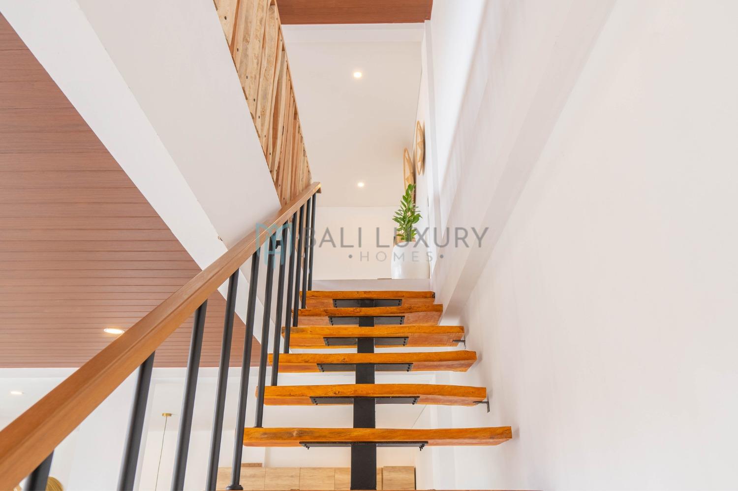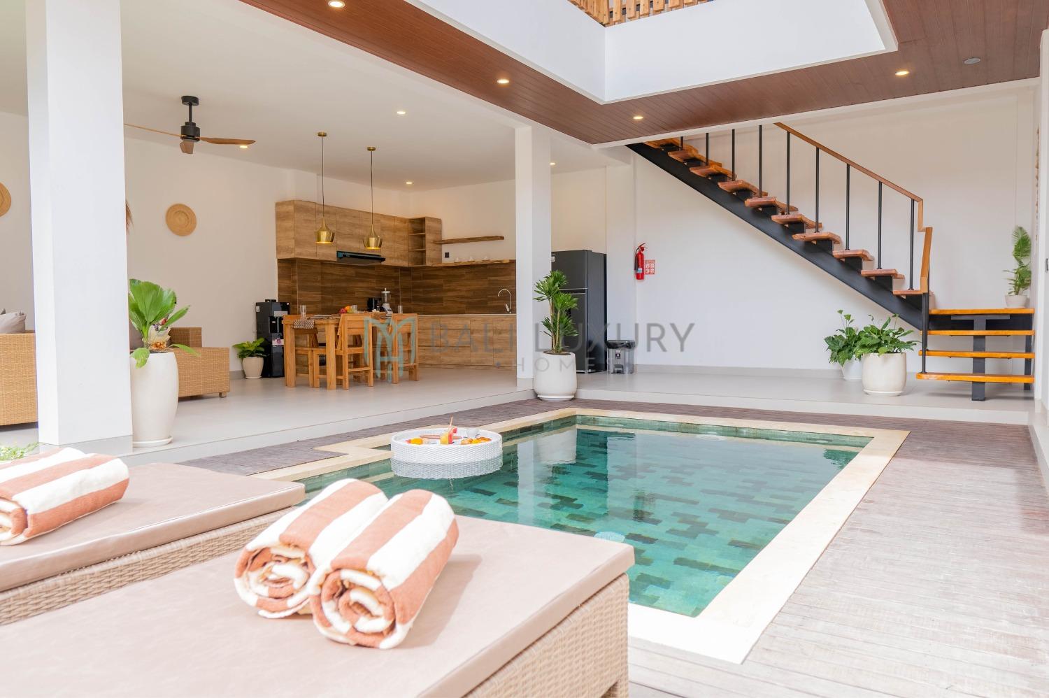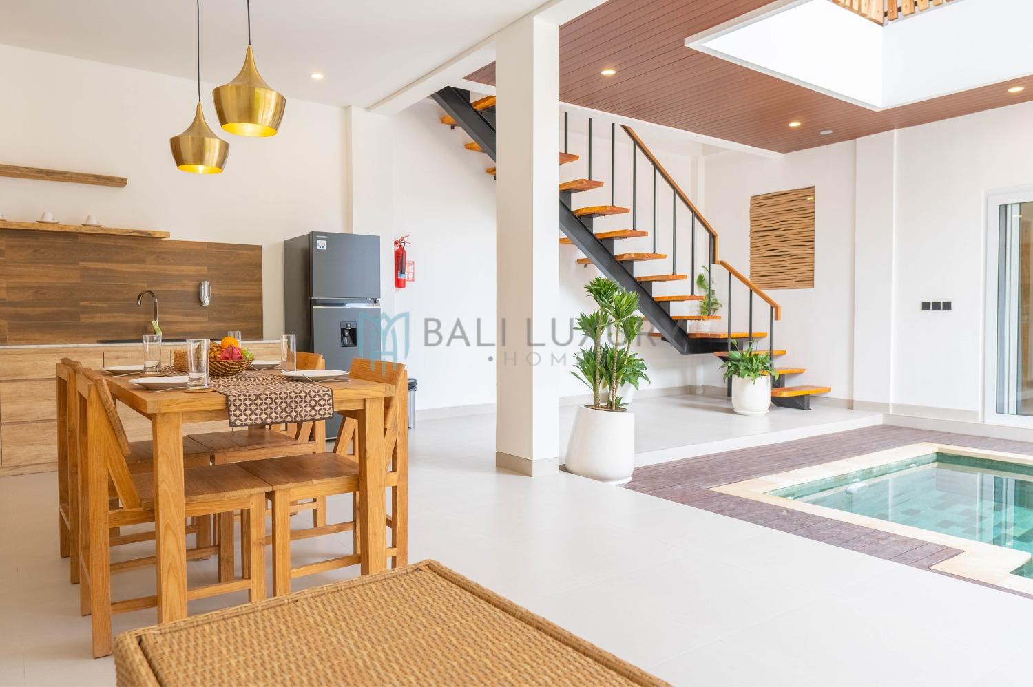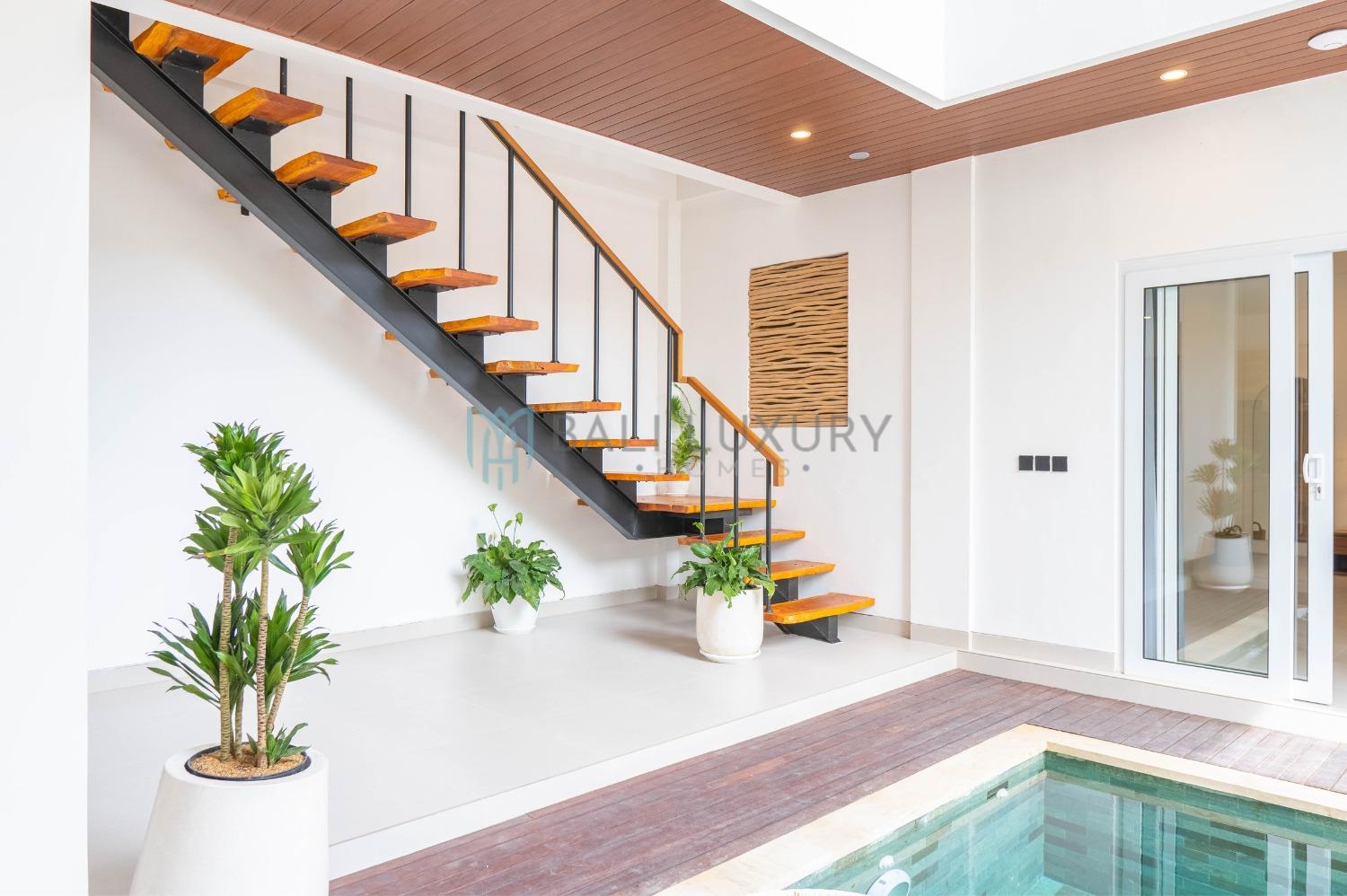 Discover your tropical retreat in Tumbak Bayuh, just 10 minutes drive to Pererenan Beach and 5 minutes away from Obsidian Gym Pererenan. This charming 2-bedroom villa blends modern comfort with Balinese charm, creating the perfect sanctuary for relaxation and remote living. The villa features a bright open dining area on the ground floor, seamlessly connected to a fully equipped kitchen and the private swimming pool surrounded by tropical greenery. Upstairs, you’ll find a cozy living room with a TV, ideal for unwinding after a long day or enjoying movie nights in comfort. Each bedroom is air-conditioned and designed for rest and privacy, complete with ensuite bathrooms and soft natural lighting. The villa’s thoughtful layout offers a smooth indoor-outdoor flow, creating an inviting atmosphere for both leisure and work.