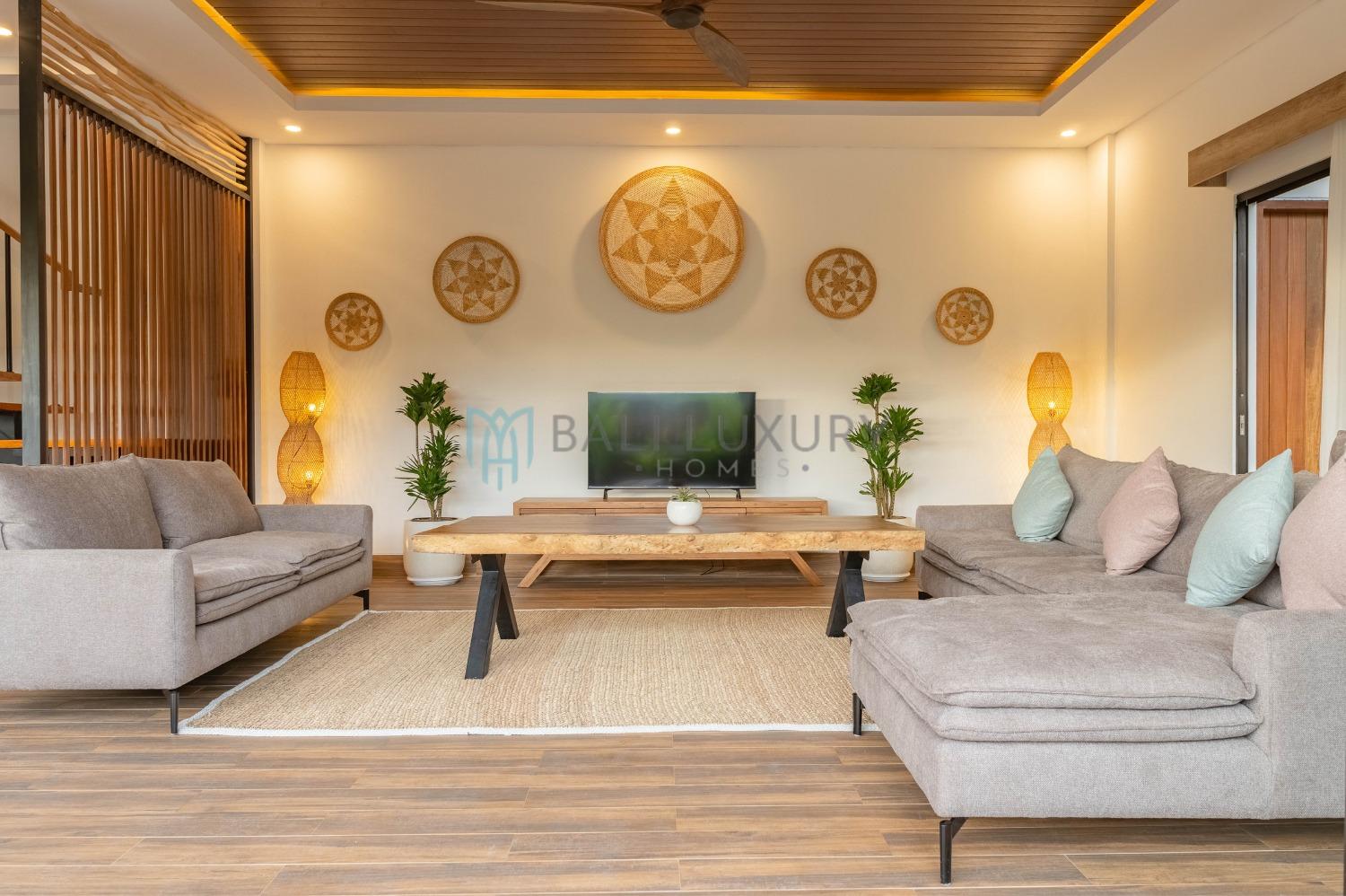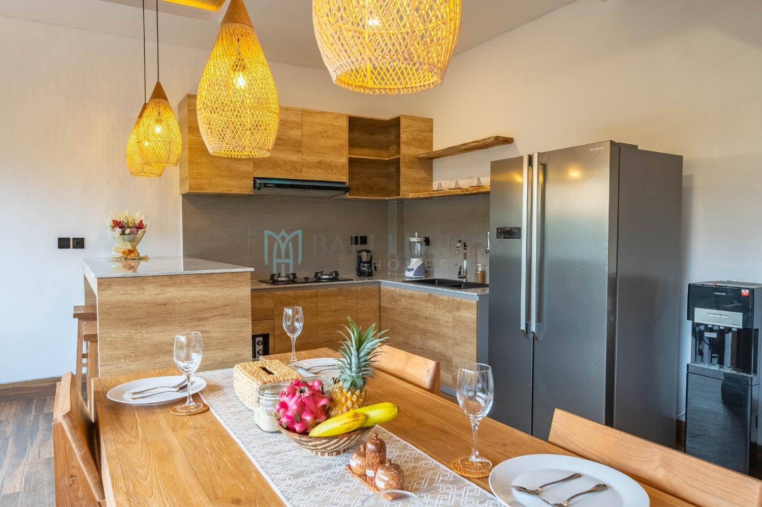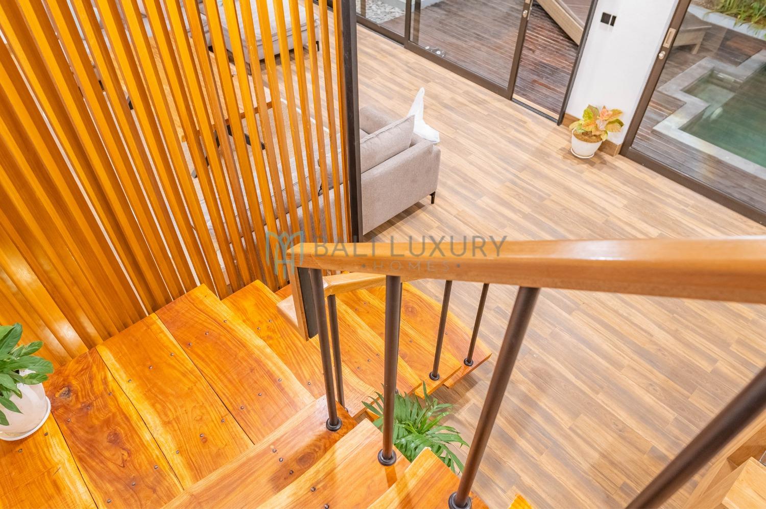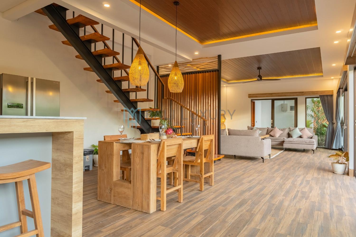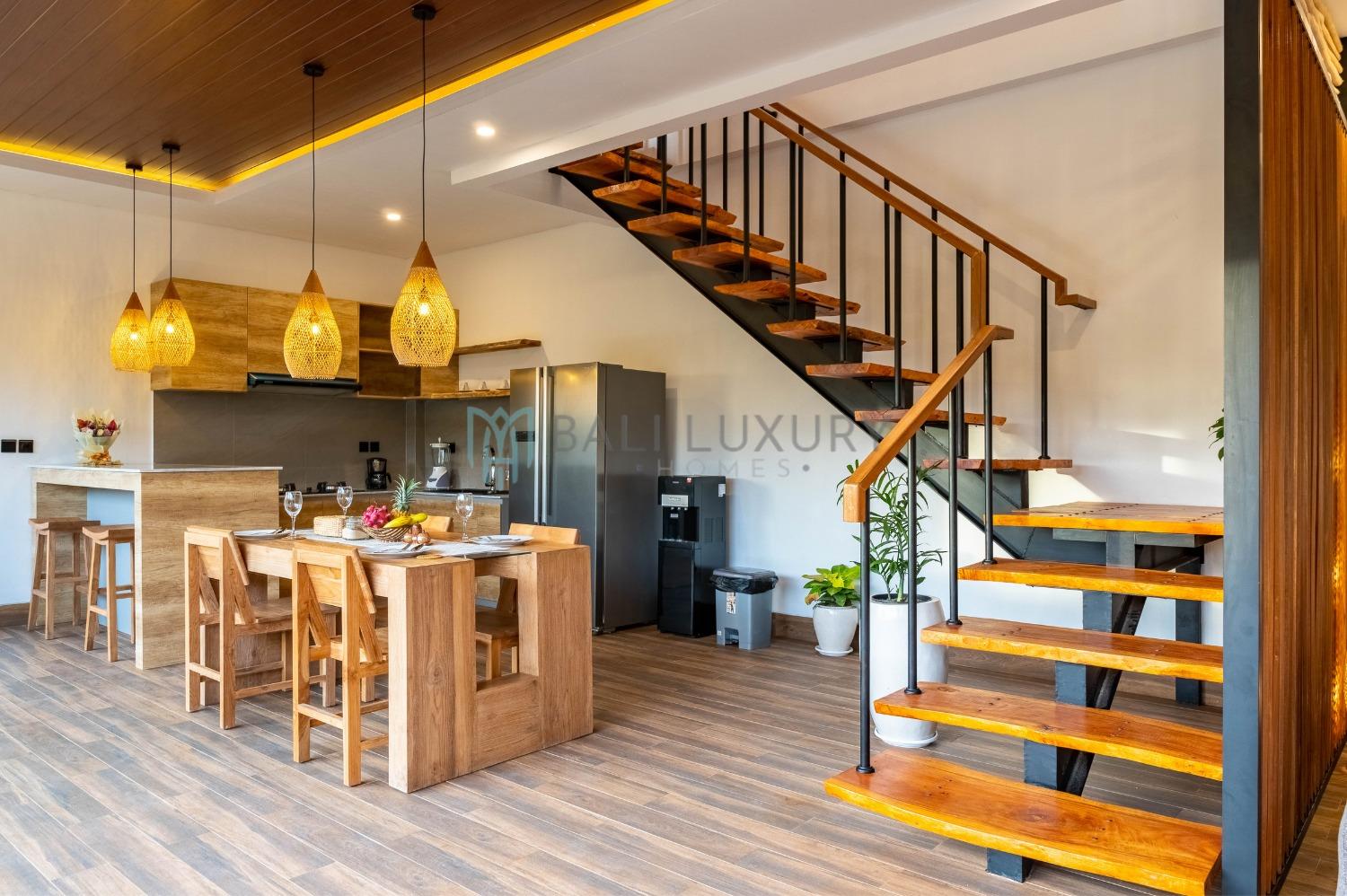 Discover your tropical retreat in Tumbak Bayuh, just 10 minutes drive to Pererenan Beach and 5 minutes away from Obsidian Gym Pererenan. This charming 2-bedroom villa blends modern comfort with Balinese charm, creating the perfect sanctuary for relaxation and remote living. The villa features a bright open dining area on the ground floor, seamlessly connected to a fully equipped kitchen and the private swimming pool surrounded by tropical greenery. Upstairs, you’ll find a cozy living room with a TV, ideal for unwinding after a long day or enjoying movie nights in comfort. Each bedroom is air-conditioned and designed for rest and privacy, complete with ensuite bathrooms and soft natural lighting. The villa’s thoughtful layout offers a smooth indoor-outdoor flow, creating an inviting atmosphere for both leisure and work.