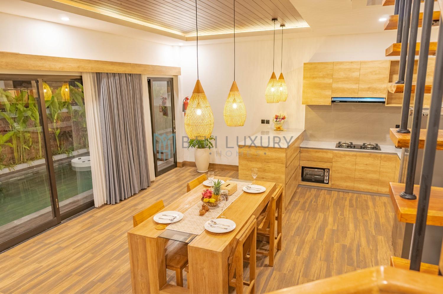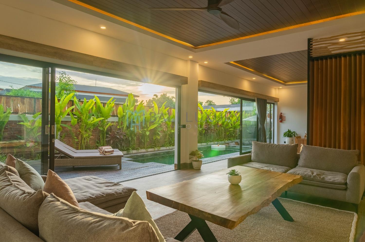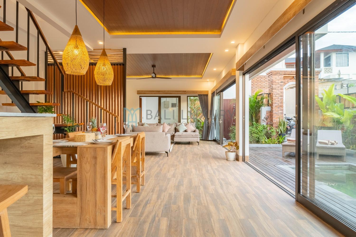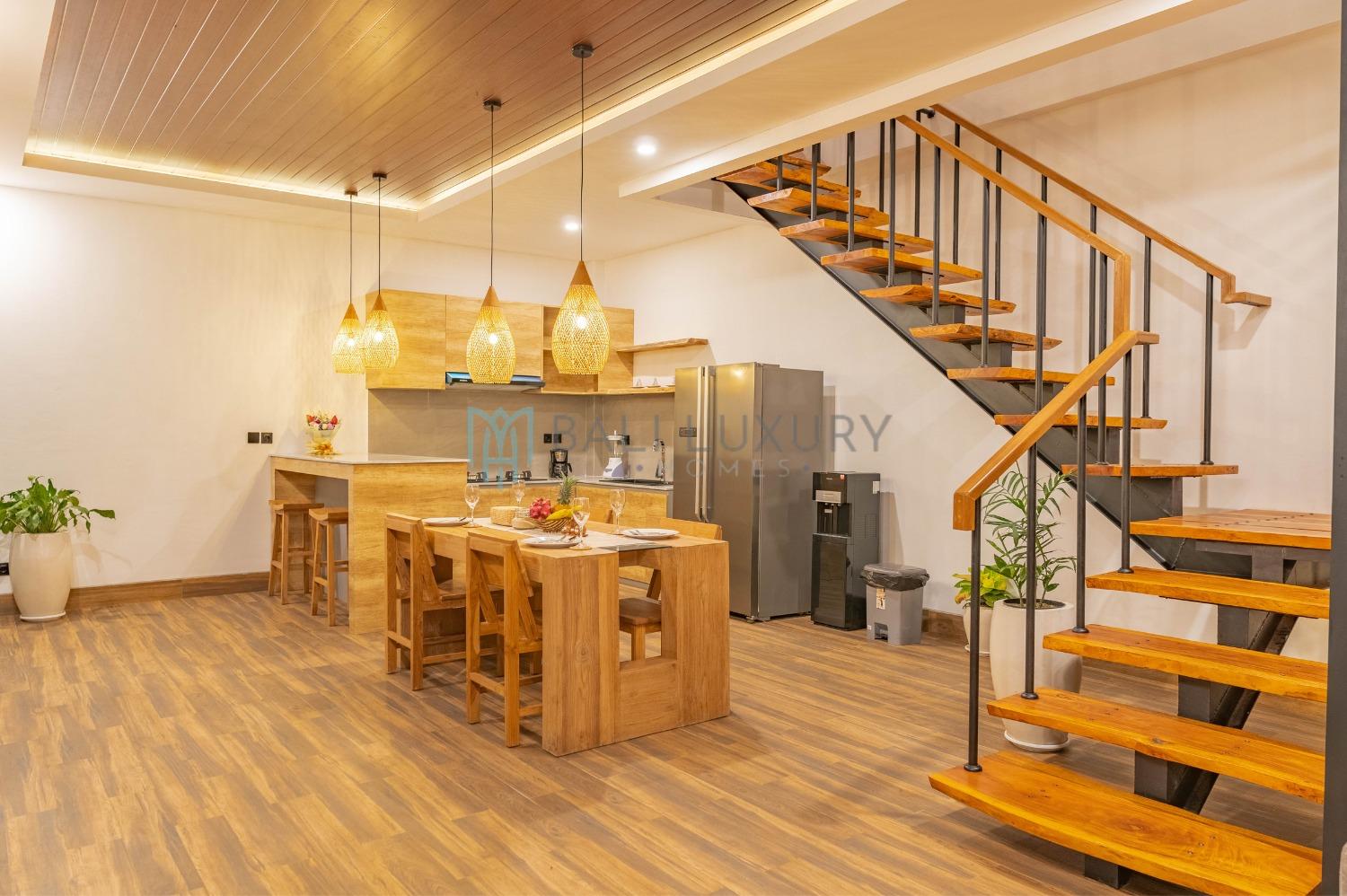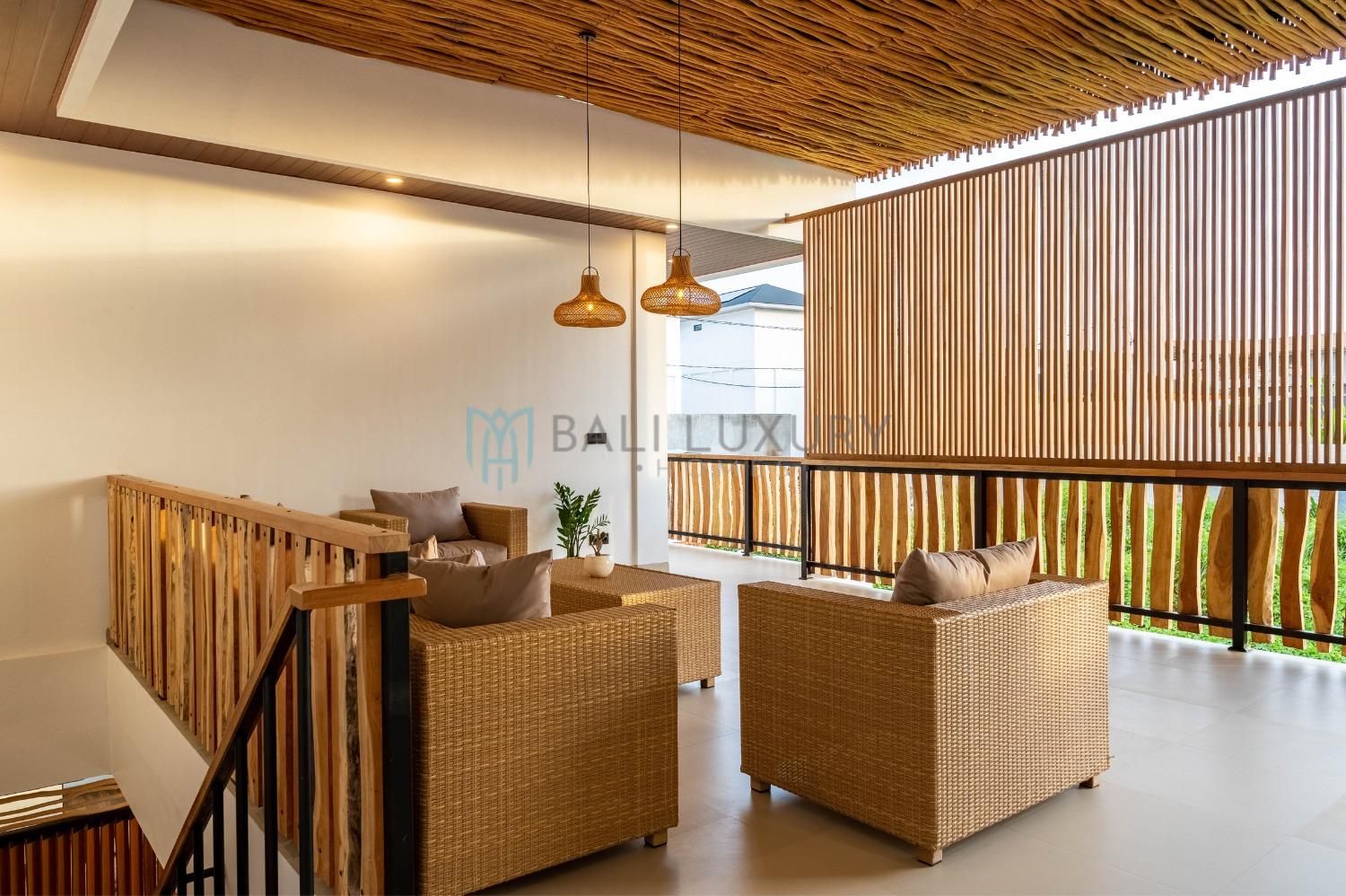 Discover your tropical retreat in Tumbak Bayuh, just 10 minutes drive to Pererenan Beach and 5 minutes away from Obsidian Gym Pererenan. This charming 2-bedroom villa blends modern comfort with Balinese charm, creating the perfect sanctuary for relaxation and remote living. The villa features a bright open dining area on the ground floor, seamlessly connected to a fully equipped kitchen and the private swimming pool surrounded by tropical greenery. Upstairs, you’ll find a cozy living room with a TV, ideal for unwinding after a long day or enjoying movie nights in comfort. Each bedroom is air-conditioned and designed for rest and privacy, complete with ensuite bathrooms and soft natural lighting. The villa’s thoughtful layout offers a smooth indoor-outdoor flow, creating an inviting atmosphere for both leisure and work.